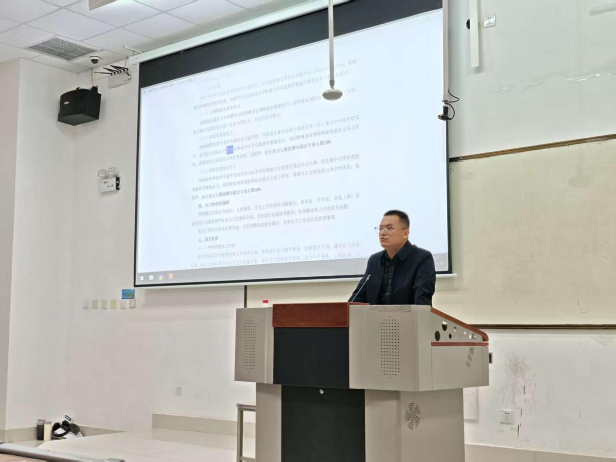 程国就本次教育实习的整体安排与具体要求作了详细部署。他首先带领与会师生学习了《商洛学院学生实习管理规定》与《商洛学院学生实践教学安全管理办法》,明确了各阶段的任务节点与考核标准。重点对实习过程管理与手册填写规范作了具体安排。他要求全体实习生:严格遵守实习学校的规章制度,深入课堂教学与班级管理实践,虚心向指导教师请教。必须认真、及时、规范地填写实习手册,详实记录听课、备课、试讲、授课及参与教研活动的主要情况与反思体会,确保内容真实、重点突出、反思深刻。程国强调,实习手册是评定实习成绩的重要依据,务必做到过程记录完整、反思总结深入、教师评语客观。他希望同学们充分认识教育实习的重要意义,在实践中巩固专业知识,提升教学技能与综合素养,圆满完成实习任务。