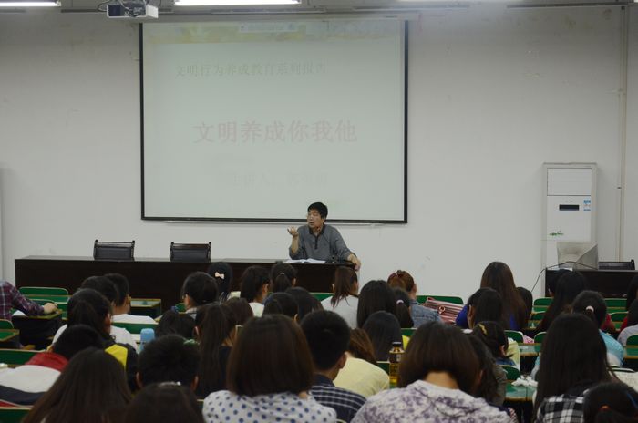 5月23日下午,校党委宣传部郭英勇部长在一号教学楼报告厅一为我院师生作了“文明养成你我他”的专题报告,院党总支副书记赵健、辅导员黄洁以及全体2012级、2013级学生共同听取了郭部长的报告。