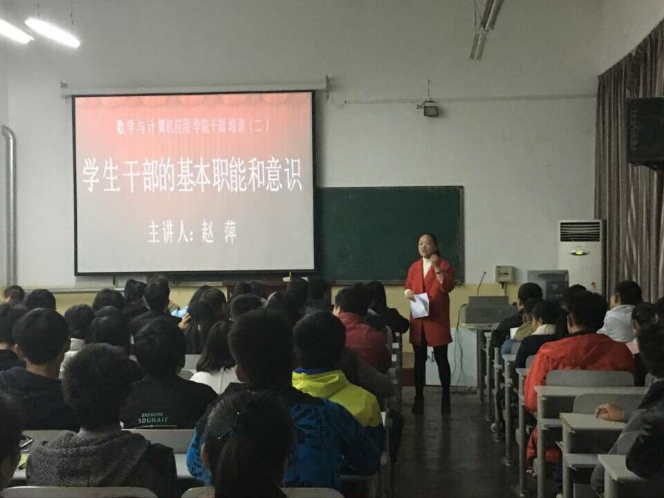 换届大会开始,田书记总结了我院过去一年的学生工作,肯定了所取得的成绩,也对上一届学生干部的辛苦付出和努力表示感谢,同时也对全体学生干部提出了殷切的希望和建议。10月27日—11月3日,数计学院学生第一党支部书记黄洁、团总支书记赵萍和学工办主任陈倩分别在二号楼323教室和多媒体17教室分三场三个专题给全院全体学生干部做了系列培训。第一场培训,黄洁副教授主要从学生干部的角色入手,讲述了学生干部的能力培养;第二场培训,赵萍老师主要讲述了学生干部的基本职能与意识;第三场培训,陈倩老师从当前学生干部意识中存在的误区入手,讲明了学生干部的作用,并详细阐述了如何成为一名优秀的学生干部。