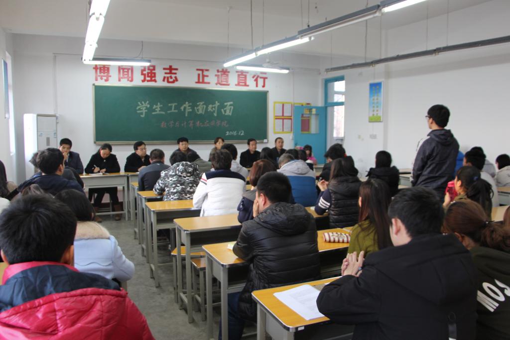 2016年12月6日16:30,数学与计算机应用学院“学生工作面对面”座谈会在二号教学楼401教室成功举办。院党总支副书记田小莉,副院长王念良,应用数学系主任刘晓民、网络工程系主任王威、党政办公室主任王宗运、学工办主任陈倩、全体辅导员黄洁、赵萍、张磊、各班学生代表和团总支学生会学生干部代表70余人参加了此次会议。会议由党政办公室主任王宗运主持。
