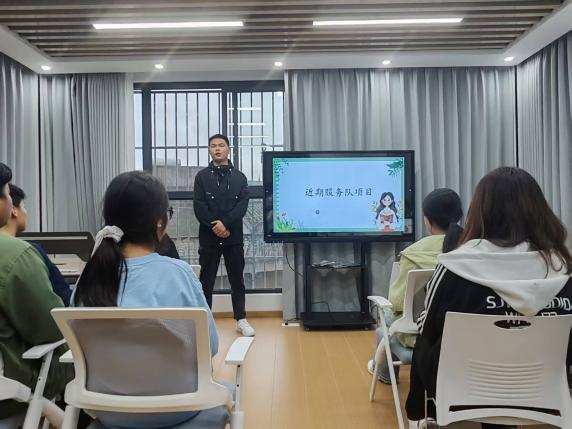 在项目介绍环节,服务队负责人重点推介了三大核心项目:第一个是福利院课业助学,通过组建专项小组,每周定期为孩子们辅导学业;第二个是“迎新杯”后勤保障,需要志愿者全程服务赛事,确保比赛顺利开展;第三个是校园文明监督岗,在固定点位值守,杜绝带餐入楼,维护教学环境整洁。具象化的项目展示,让新生能提前规划参与方向。
