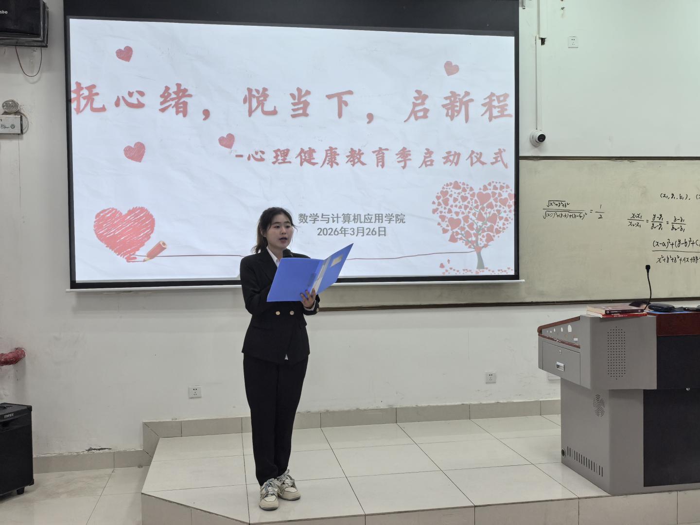 启动仪式环节有序推进,第一项议程中,学院教师殷琳上台宣读了数学与计算机应用学院心理季活动方案,详细介绍了本次心理季的各项活动安排、开展目的与预期效果,让同学们对后续活动有了清晰了解。