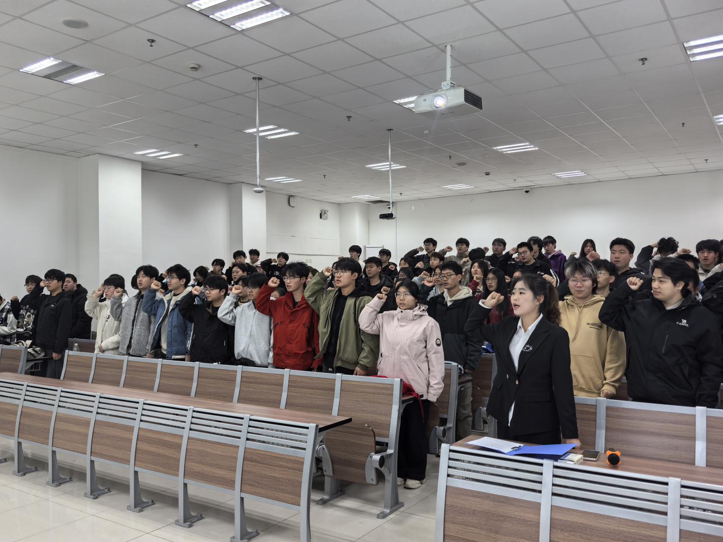 在心理健康集体宣誓环节,全体同学起立、举起右手,跟随领誓人张楠同学庄严宣誓,“珍爱生命,悦纳自我;调适心态,积极向上……以梦为马,不负韶华”,铿锵有力的誓言回荡在现场,既是同学们对自我心灵守护的承诺,也是对彼此成长同行的约定。宣誓完毕后,同学们有序上台,在主题横幅上签下自己的名字,许下关注心理健康、践行积极生活的郑重承诺。签字结束后,全体同学前往八号教学楼前合影留念。