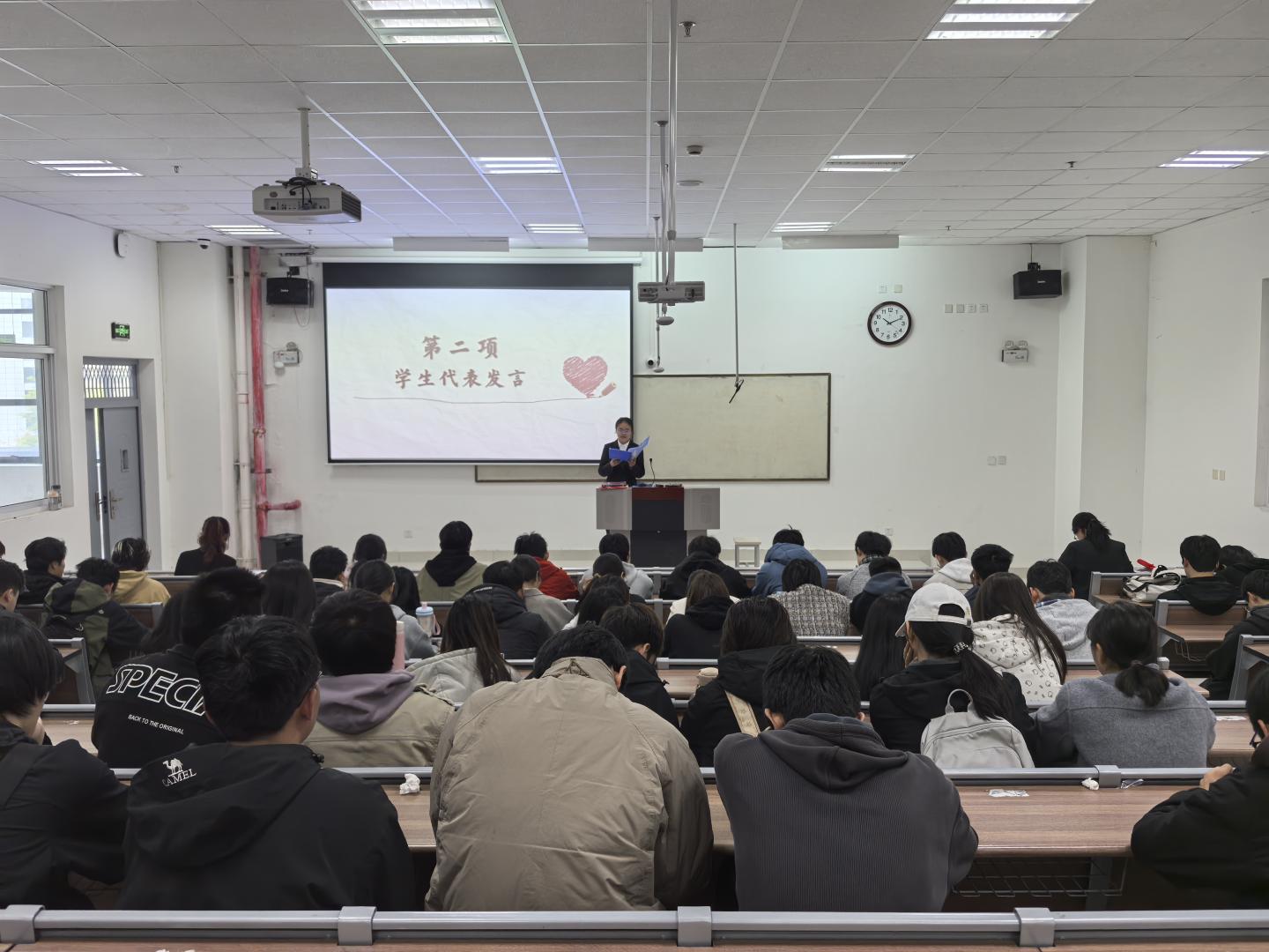 随后进入学生代表发言环节,计算机2402班刘思源同学上台,结合自身心理成长经历分享感悟,发出关爱自我、赋能成长的青春倡议,话语真诚有力、充满正能量,引发在场同学的强烈共鸣。