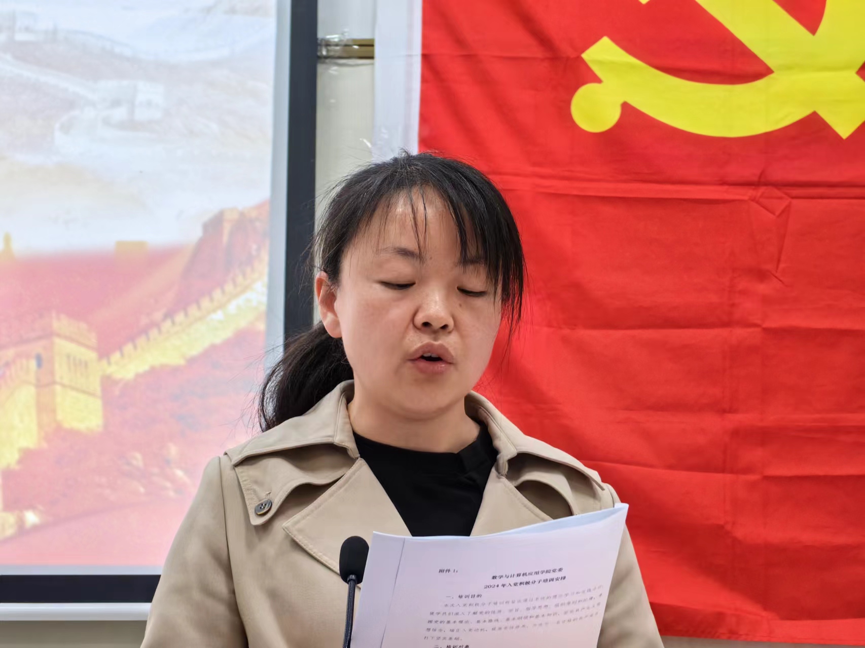 开班仪式上,院党委组织员赵萍宣读了《数学与计算机应用学院党委2024年入党积极分子培训班培训方案》,对培训班的课程纪律要求和考试安排进行了说明,要求全体学员遵守各项纪律、严格要求自己。学员代表网络2202班梁振海在发言中希望大家能够通过党课学习有所收获,并以成为一名合格的党员为目标,为成为一名有理想、有信念的优秀青年努力奋斗。
