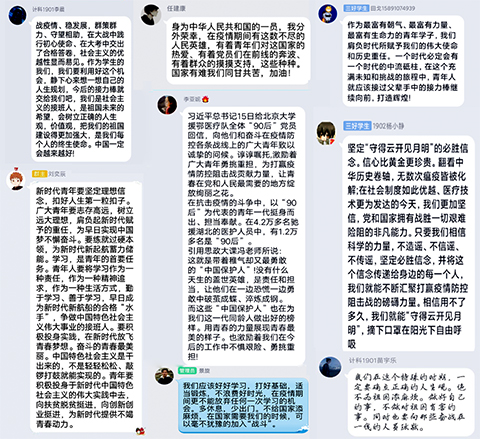 网工1701班蔺靖敬:“习近平总书记写的回信中,满满的都是关心与激励。在这场抗疫斗争的关键阶段,站好最后一班岗,打赢疫情歼灭战,贡献“90后”的青春力量!90后也可以守护好中国,他们是前行者,我们是后备军,一起加油!”