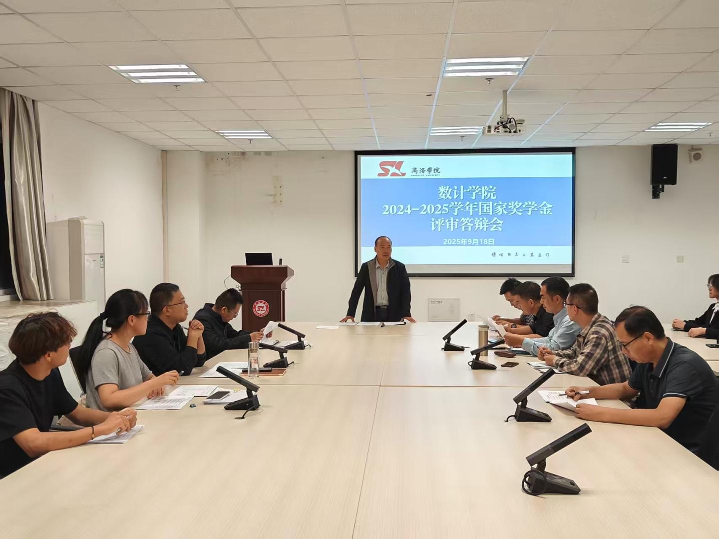 2025年9月18日19:00,数计学院在8-616会议室举行国家奖学金答辩评审会。本次评审会由学院党政领导班子成员、各系主任、教师代表、辅导员代表及学生代表共同组成评委团,对7名经年级专业推荐的优秀候选人进行公开评审。
